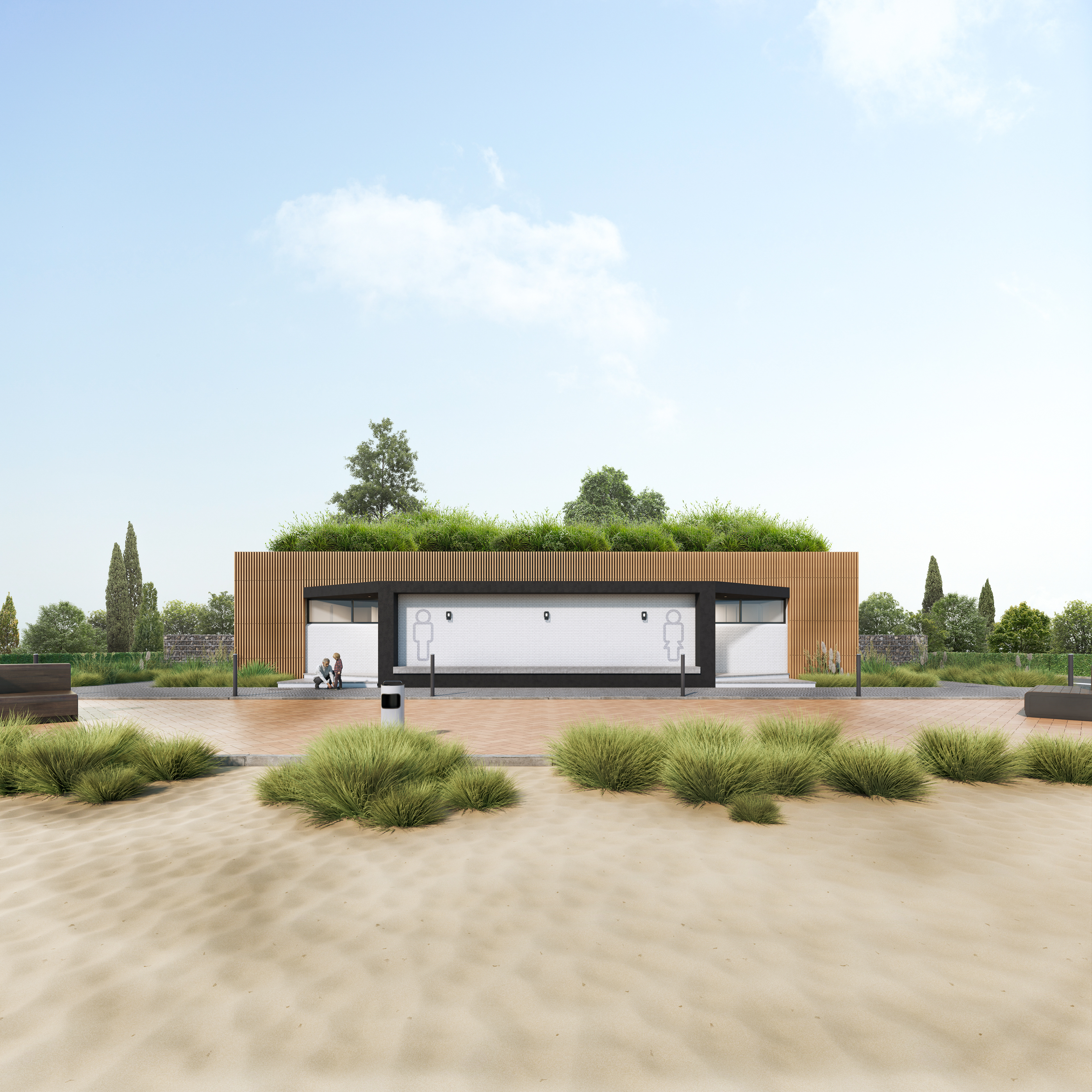 Within this broader vision, even the most functional elements were treated as architectural opportunities. The ablution facilities were conceived as sculptural pavilions rather than background structures — simple, grounded forms wrapped in vertical timber screening that lends warmth, texture and rhythm to the landscape. Their clean geometry allows them to sit confidently within the open park setting while remaining visually understated.
